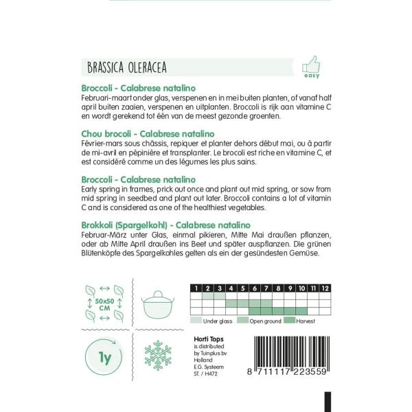 Broccoli Calabria Natalino is één van de meest gezonde groente met een overvloed aan vitamine C. Zaaien in februari – maart onder glas en verspenen in mei. Vanaf half april buiten zaaien.