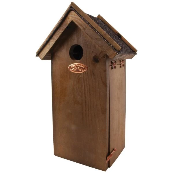 Het dak is afgewerkt met bitumen zodat het goed waterdicht is. Het zijpaneel kan open om de nestkast na het broedseizoen, in het najaar te reinigen.