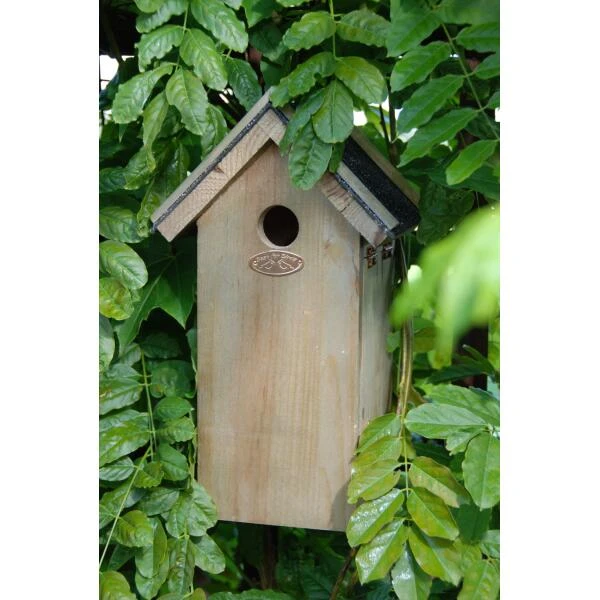 Deze traditionele nestkast met een landelijke look is een warme thuis voor verschillende vogelsoorten zoals de koolmees, pimpelmees, ring- en huismus, boomklever en bonte vliegenvanger. Door de nestkast in je tuin of bij jou in de buurt op te hangen, help je bij het behoud van populaties in een bepaald gebied.