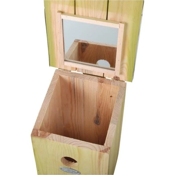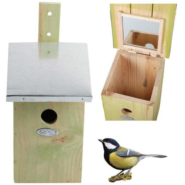 Met deze fraaie nestkast voor mezen kan je, dankzij de ingebouwde spiegel in het dak, de bewoners makkelijk observeren. Het dak kan vlot worden opgetild en dan kan men via de spiegel aan de binnenzijde in de nestkast kijken. Inspectie van de nestkast wordt aangeraden in het najaar in verband met de jaarlijkse schoonmaakbeurt. Inspecteren tijdens het broedseizoen moet uiterst voorzichtig gebeuren en niet te vaak om vervroegd uitvliegen te voorkomen.