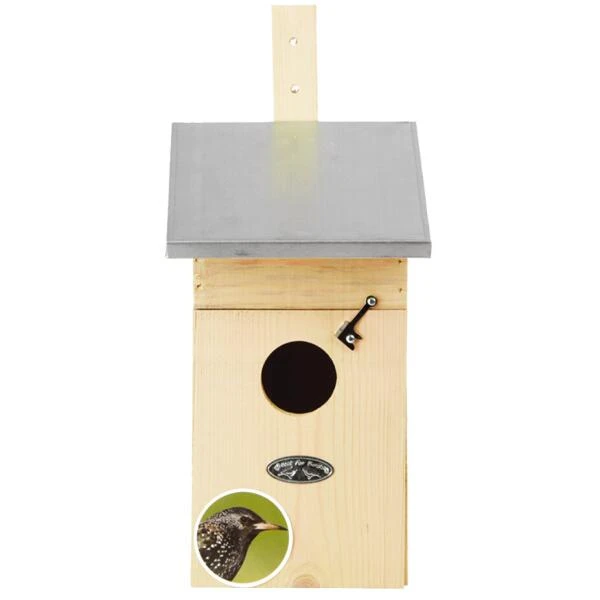 Deze nestkast met zinken dak is, dankzij de invliegopening van 45 mm, geschikt voor de spreeuw. Hang ze op een rustige enigszins beschutte plaats en zeker niet pal in de zon of op de regenzijde. Houd de aanvliegroute vrij. Ook ik de winter doet deze kast dienst als schuilplaats voor diverse vogels.