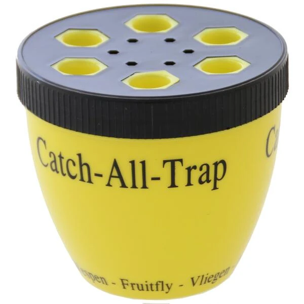 Handige val voor fruitvliegen. Voor het gebruik doorprik je de gaatjes in de zes gele trechters van het deksel en wordt de fruitvliegenval actief.