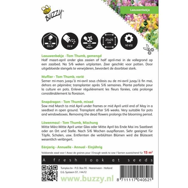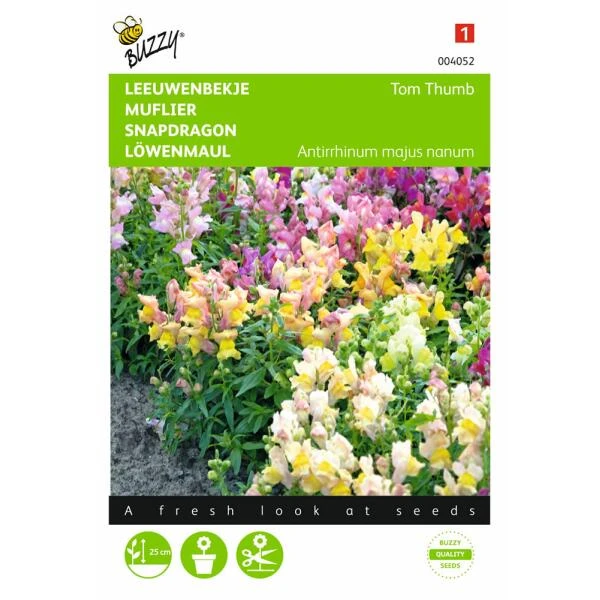 Leeuwenbekje Tom Thumb bloeit in verschillende tinten: roze, rood, geel, oranje en wit. Het is een sterke laagblijvende plant die makkelijk te kweken is. De leeuwenbek bloemen zijn ware magneten voor bijen, hommels en andere insecten. Ze verkiezen een plek in de zon en een goed waterdoorlatende bodem. Ook ideaal om in potten te zaaien.