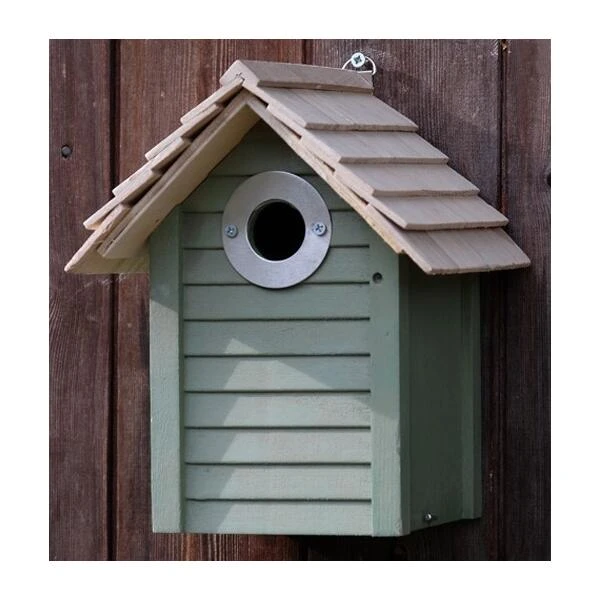 Dit prachtig vogelhuisje doet je denken aan een authentiek strandhuisje met een shingeldak en is heel mooi afgewerkt in een pastelgroene tint. De invliegopening van 32 mm is voorzien van een metalen plaatje en is geschikt voor alle soorten meesjes.
