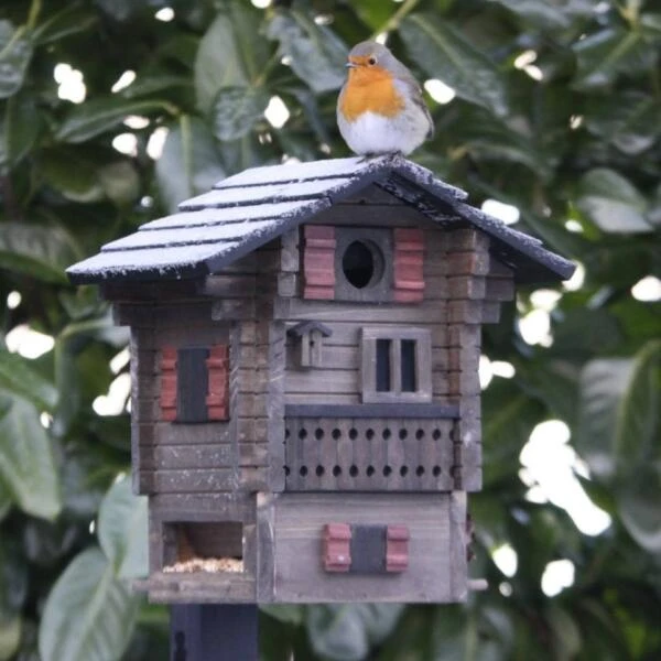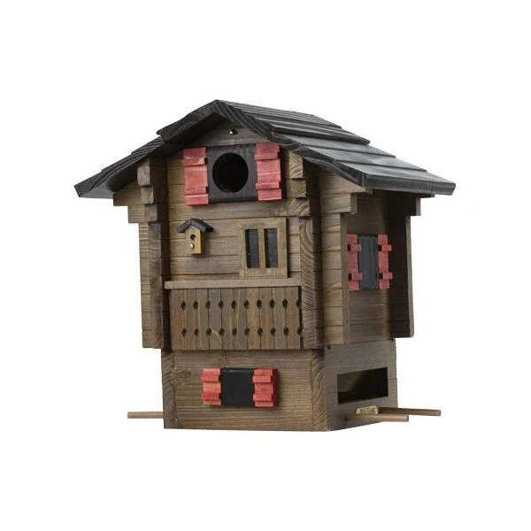 Het voederhuisje bevat een 2- liter reservoir voor vogelzaad. Het voer ligt goed beschermd tegen wind en regen. Dankzij de kleine zitstokjes onder de voedervensters kunnen kleine vogels rustig hun maal oppikken. Grote vogels hebben er geen houwvast op en zullen dus wegblijven van het voer. Tevens verhindert deze constructie dat uitwerpselen in het voer terecht komen. Dit maakt deze chalet in de voederperiode tot een druk bezochte voederplaats van diverse vogels. De ronde invliegopening kan afgesloten worden op het moment dat de chalet als voederhuisje dienst doet.
