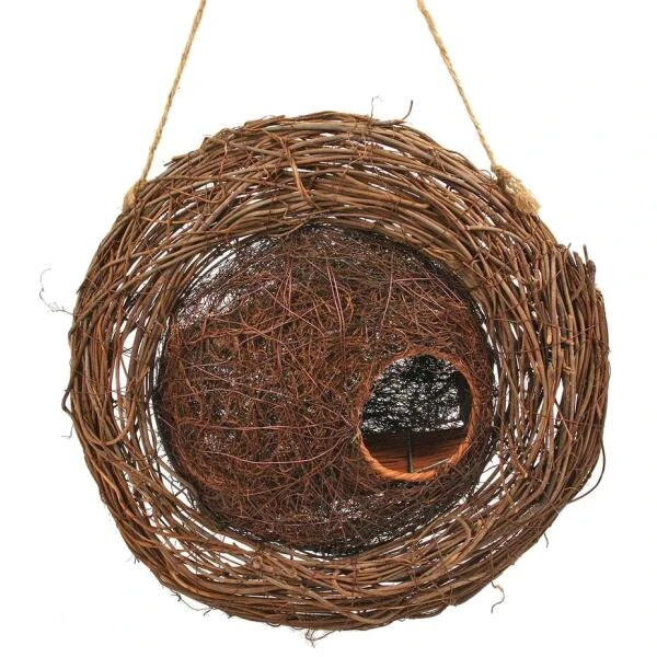 Veel vogels verkiezen een nestkast die makkelijk toegankelijk is maar die toch bescherming biedt aan de jonge vogels tegen predatoren. De ruime ingang weggestopt achter de zijwand en overdekt door het dak, vormt het ideale nest. Door de krans te verfraaien met bladeren, bessen, twijgjes en bloemen krijg je bovendien een geweldige rustplaats voor kleine vogels die in de winter willen schuilen tijdens barre weersomstandigheden. Het groen vormt een extra camouflage rond het nest en is daarnaast ook een leuke aankleding voor de tuin.