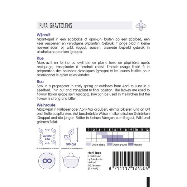 Het jonge blad is uitstekend in kleine hoeveelheden bij wild, ragout en in sauzen. Wijnruit wordt beperkt gebruikt in alcoholische dranken zoals grappa. Eénjarige plant met grijsgroen blad en gele bloemetjes.