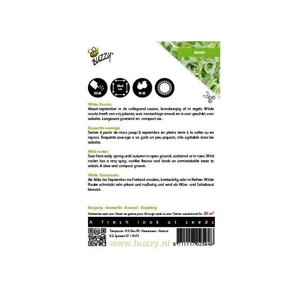 Zaden Diplotaxis tenuifolia zaaien: vanaf maart tot september in de vollegrond, breedwerpig of in regels. Rucola heeft een pikante, wat nootachtige smaak en is zeer geschikt voor salades.